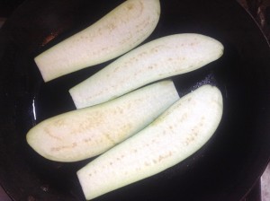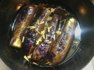 フライパンに多めのごま油を敷き、茄子を焼き揚げする。