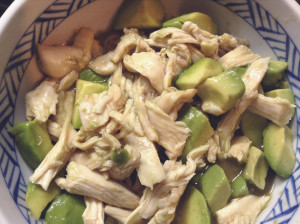 鶏胸肉に火が通ったら手で食べやすい大きさに割き、アボカド・調味料を混ぜ和える。