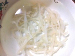 中華くらげは塩分が強いので、最低1時間はしっかり水に漬けて塩抜きします。