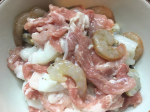 豚肉とシーフードミックスに塩・こしょうを振り混ぜ、下味を付ける。