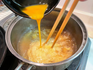 もう一方の手で、溶き卵を出来るだけゆっくりと細く流し入れます。