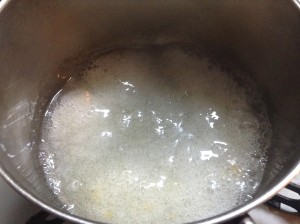 色が白濁の状態から透明感が出るまで、加熱したまま良く混ぜてください。