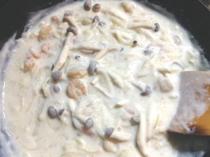 弱火にし、牛乳を3~4回に分け入れ、ダマにならないようによく混ぜる。