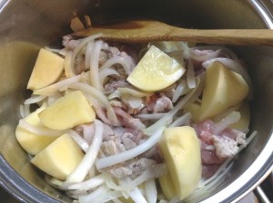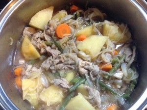 鍋に油を敷き、玉ねぎ→肉→じゃがいもの順に入れ、軽く炒める。