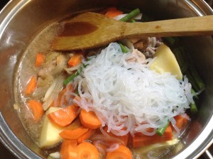 10分ほど煮込んだら、一度アクを取り、さやいんげん・しらたきを入れ、更に5分~10分ほど煮込む。
