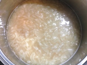 玉ねぎを鍋に移し、水・コンソメを入れ火にかける。