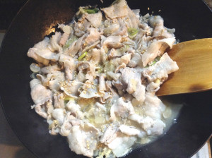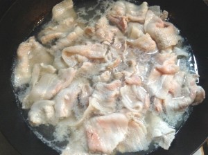 少量の湯を沸かし、軽く色が変わるまで豚バラ肉をボイルする。