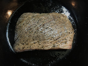 フライパンに油を敷き、ローズマリーを入れ、肉の表面を強火で一気に焼け目がつくくらいに焼く。