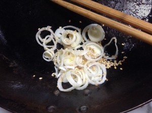 フライパンにごま油を敷き、輪切りにした長ネギに塩・こしょう・白ゴマを入れ、軽く炒めます。