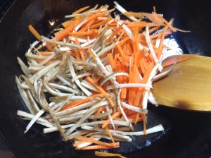 ごぼうとにんじんを入れ、炒める。