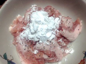 豚肉に塩・こしょう・酒・片栗粉をよくもみ込み、冷蔵庫で30分ほど寝かす。