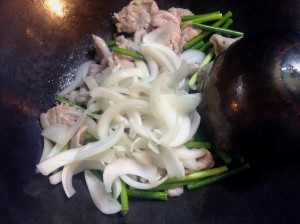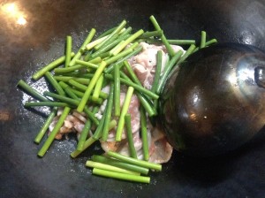 肉に軽く火が通ったら、ニンニクの芽を入れ炒める。