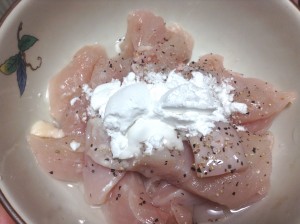 鶏胸肉に塩・こしょう・酒・片栗粉をよく馴染ませる。