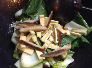 肉に8割ほど火が通ったら、チンゲン菜・油揚げ・椎茸を入れ炒める。