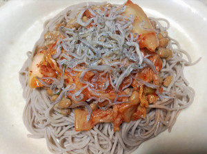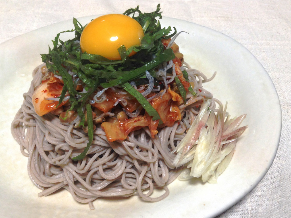 そばの上に、キムチ・納豆・じゃこ・大葉の順に乗せる。
