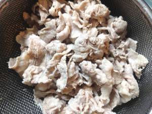 沸騰した湯に豚肉を入れ、茹でる。