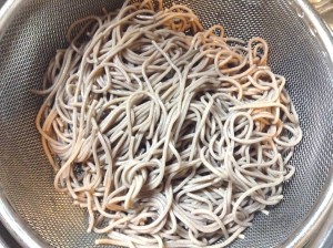 そばが茹で上がったら冷水でよくぬめりを取る。