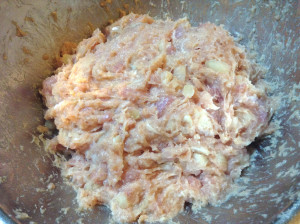 粘りが出るまで練ることにより、肉汁が閉じ込められやすくなり、また肉が結着しやすくなります。
