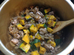 赤ワインが蒸発したら、かぼちゃとローリエを入れ、塩・こしょうを振り、炒める。